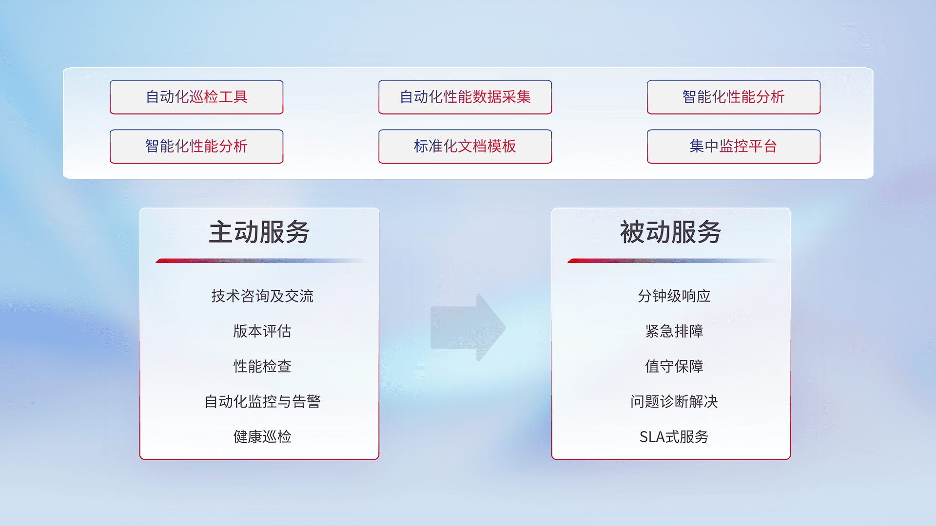 智能化工具和标准化文档,,,,保障服务质量,,,,提供主动服务(包含技术咨询、、版本评估、、、、性能检查、、自动化监控与告警、、、健康巡检)和被动服务包含(分钟级响应、、、、紧急排障、、、、值守保障、、、问题诊断解决、、、、SLA服务)。。。。